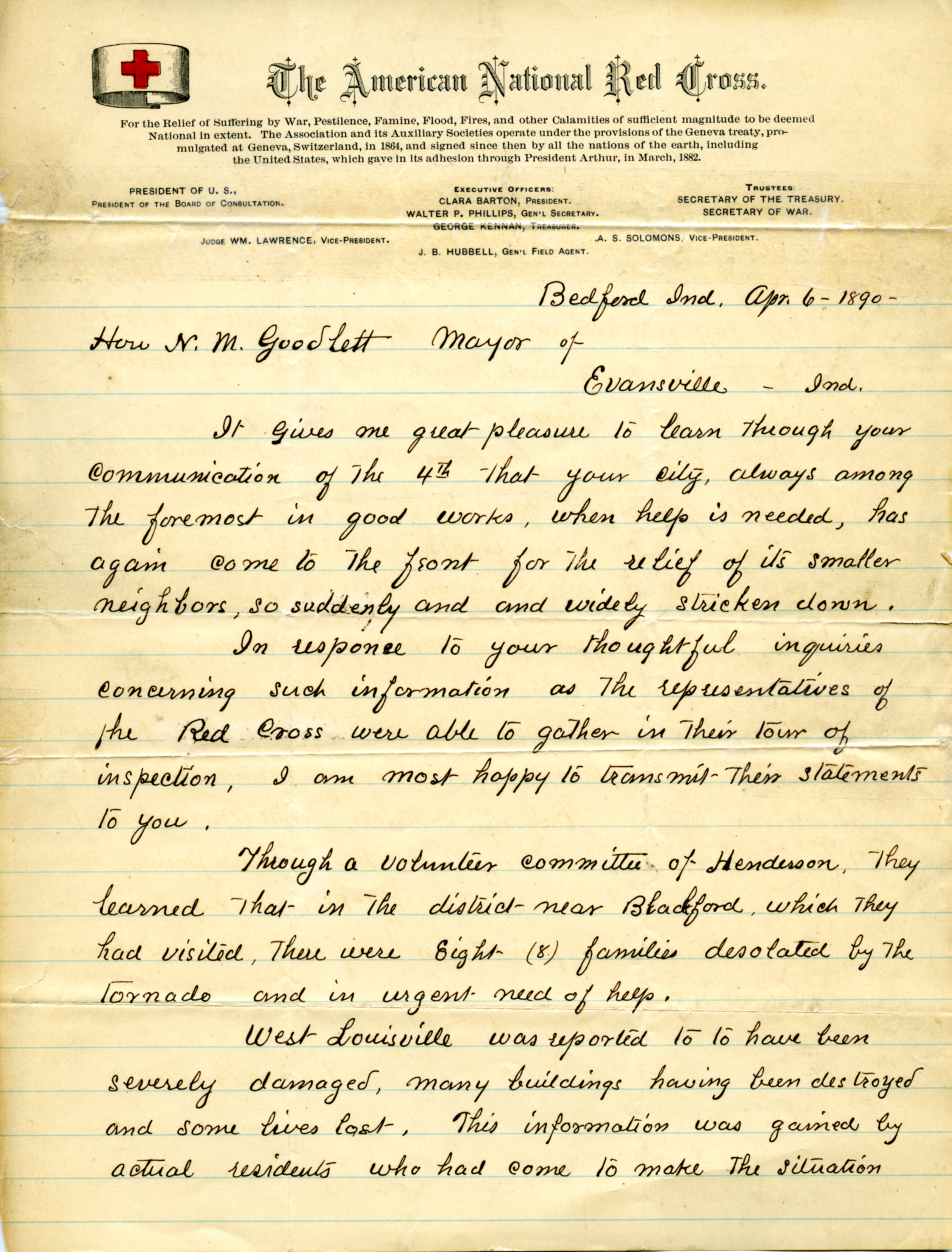The American National Red Cross For the relief of suffering by war, pestilence, famine, flood, fires, and other calamities of sufficient magnitude to be deemed national in extent. The Association and its Auxiliary Societies operate under the provisions of the Geneva treaty, promulgated at Geneva, Switzerland, in 1864, and signed since then by all the nations of the earth, including the United States, which gave in its adhesion through President Arthur, in March 1882. President of U.S. President of the Board of Consultation. Executive Officers Clara Burton, President Walter P. Phillips, General Secretary George Kennan, Treasurer Trustees Secretary of the Treasury Secretary of War Judge William Lawrence, Vice-President A.S. Solomons, Vice-President J.B. Hubbell, General Field Agent Beginning of the Letter Bedford, Indiana. April 6, 1890 Honorable N. M. Goodlett, Mayor of Evansville, Indiana, It gives me great pleasure to learn through tour communication of the 4th that your city, always among the foremost in good works, when help is needed, has again come to the front for the relief of its smaller neighbors, so suddenly and widely stricken down. In response to your thoughtful inquiries concerning such information as the representatives of the Red Cross were able to gather in their tour of inspection, I am most happy to transmit their statements to you. Through a volunteer committee of Henderson, they learned that in the district near Blackford, which they had visited, there were eight families desolated by the tornado and in urgent need of help. West Louisville was reported to have been severely damaged, many buildings, having been destroyed and some lives lost. This information was gained by actual residents who had come to make the situation