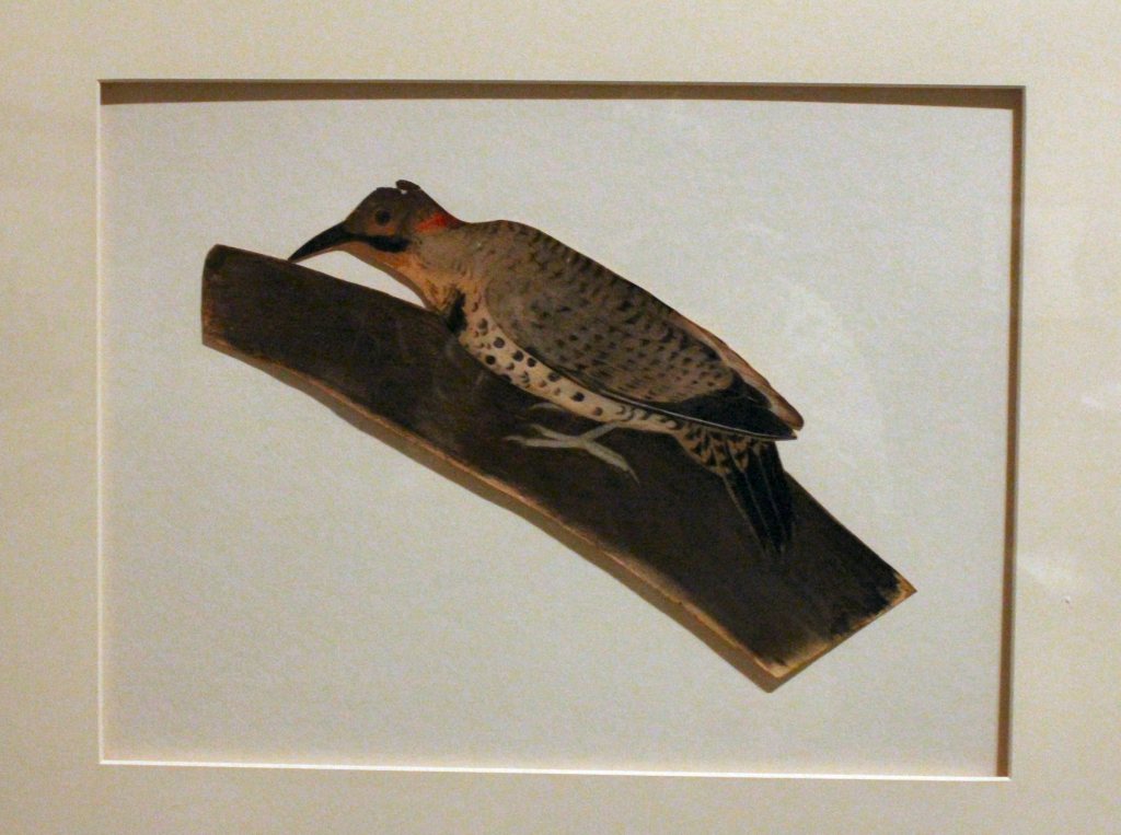 The world-famous artist and naturalist John James Audubon lived in Henderson, Kentucky with his family from 1810 to 1819. During this period, Audubon followed his passion for observing birds and made an effort to improve his drawings of them. He created this original watercolor and crayon drawing of a golden-winged woodpecker, or flicker, around 1819 at the Henderson home of his friend, Judge Thomas Towles (1784-1850). The drawing shows a single male flicker with brown feathers and black spots perched on a tree branch. It was cut out and pasted onto a paper backing. Audubon gifted the Golden-winged Woodpecker to Judge Towles. The drawing was passed down through the family and later given to the Henderson County Historical Society, who in turn donated it to the Audubon Museum in 1938.”