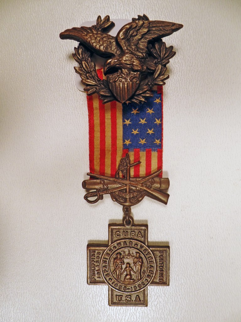 This museum’s Oldest Category item is a Spanish American War Veteran’s Medal from 1902. This 3-piece bronze medal is 2 5/8” x 7/8” x 1/4″. “Members of the United Spanish War Veterans received these medals. The organization consisted of veterans of the Spanish-American War, the Philippine-American War, and the China Relief Expedition (Boxer Rebellion). It was among numerous fraternal societies created by veterans to stay in contact. The United Spanish War Veterans ceased to exist with the passing of its last member in 1992. (Sources: Library of Congress and Collection of the Smithsonian National Museum of African American History and Culture)” At the top an “American eagle in flight, a laurel wreath forms the background, with a stars and stripes shield overlay. An American flag-inspired ribbon connects the medal’s elements. [Above the medal is a] crossed calvary saber, infantry rifle and navel anchor suspension with two-sided war cross.”