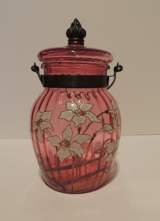 Next is this cranberry glass cracker jar. Made in France circa 1875- 1920, it measures 9”H x 5”W and has a metal neck with handle. It’s the museum’s Curator’s Choice, both for its beauty and because it’s the museum’s newest acquisition, just received in September 2020.