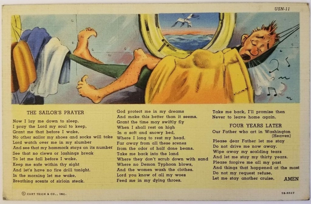 The USS LST Ship Memorial, Inc., located on Evansville’s riverfront, contributed two items. The first, in the Funniest category, is this Curt Teich & Co. Sailor’s Prayer Postcard from 1941. It’s a novelty postcard featuring a cartoon image of a sailor sleeping and snoring heavily in a hammock aboard a ship. The LST museum nominator Andrew Schade says, “Both the cartoon and the poem poke fun at the experiences of sailors and provide a humorous glimpse into their lives aboard ship. The final stanza offers an abrupt shift in tone, similar to the final verse of Allan Sherman’s 1963 song, “Hello Muddah, Hello Fadduh.”