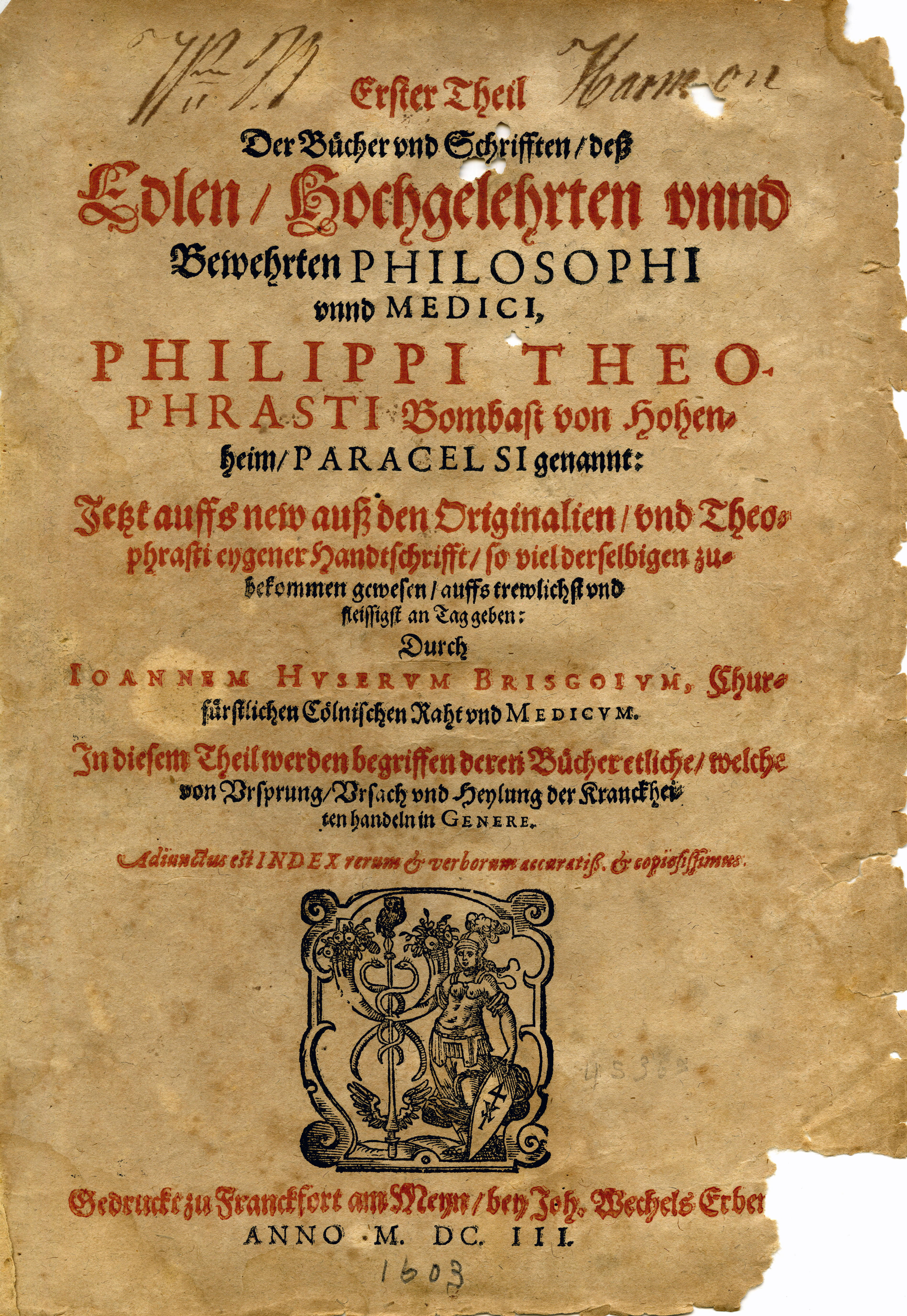 Our Oldest category item is this 1603 alchemy book by Paracelsus: The archidoxes of magic : celestial medicines, magical cure of diseases, mysteries of the Zodiac, occult philosophy, secrets of alchemy, spirits of the planets, supreme mysteries of nature. Paracelsus (1493-1541) was a German-Swiss physician and alchemist (alchemy was the study of turning lead into gold). He did not hold with contemporary medical thinking, urging that the wisdom of old wives, sorcerers, gypsies, and the like held equal value. He must have held a very high opinion of himself—the very name he gave himself, Paracelsus, means above (para) Celsus, a very respected 1st century Roman medical writer. Note the zodiac on the picture of the open spread of the book.