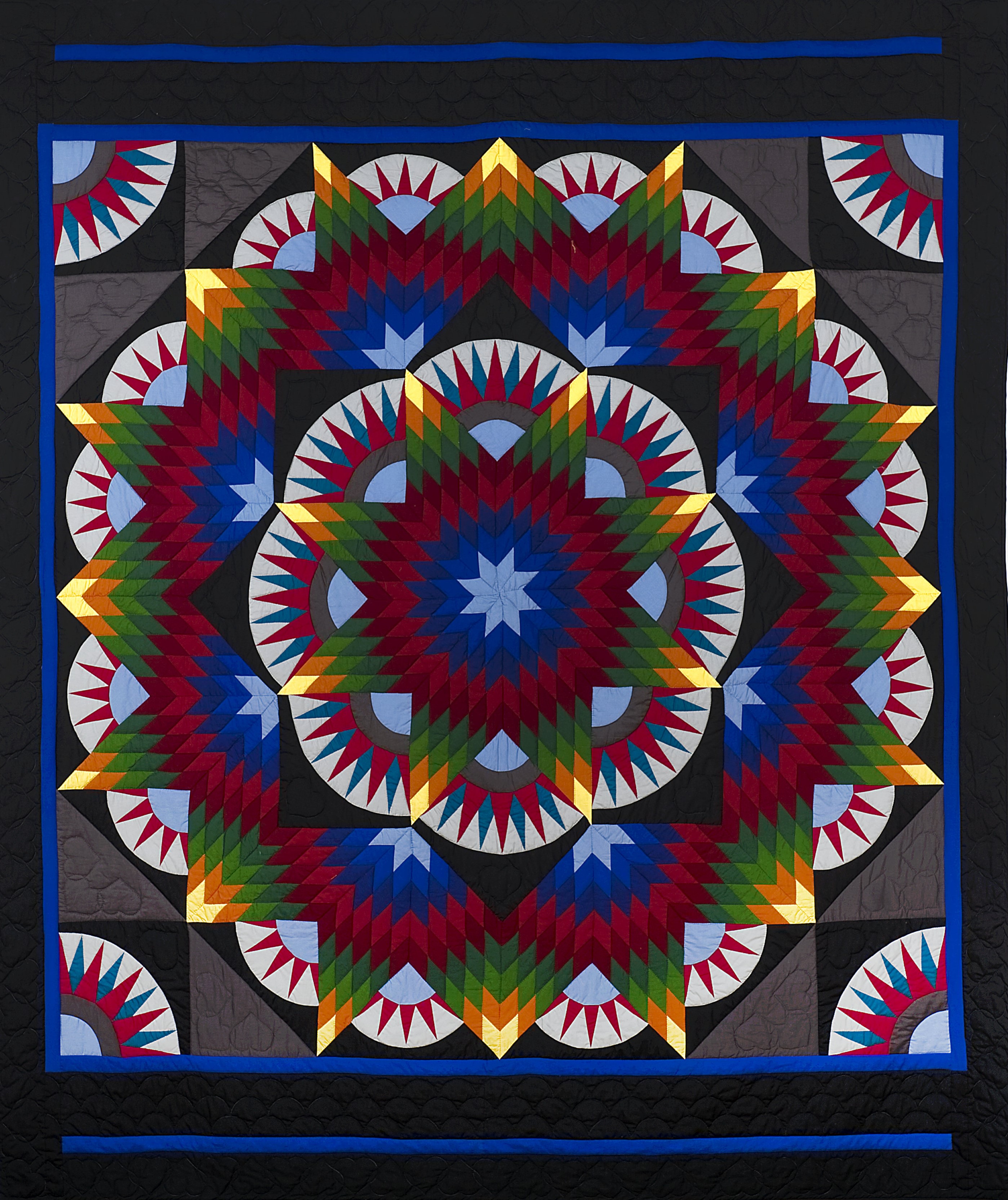“Rising Sun”, 2003, Machine pieced and hand quilted medallion style quilt by Amos A. Graber, Miriam Graber, and Delores Kemp of the Old Order Amish community in Montgomery, Indiana. The quilt measures 107” long and 92” wide and is made from cotton and cotton/polyester blend fabrics.