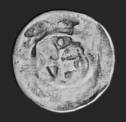 This German heller coin was minted in the town of Schwäbisch Hall during the period of what is now call the Bubonic Plague that overtook Europe from 1347 to 1350. The obverse is the image of the Hand of God and the reverse has a cross with arms ending in pellets, all within a circular border.