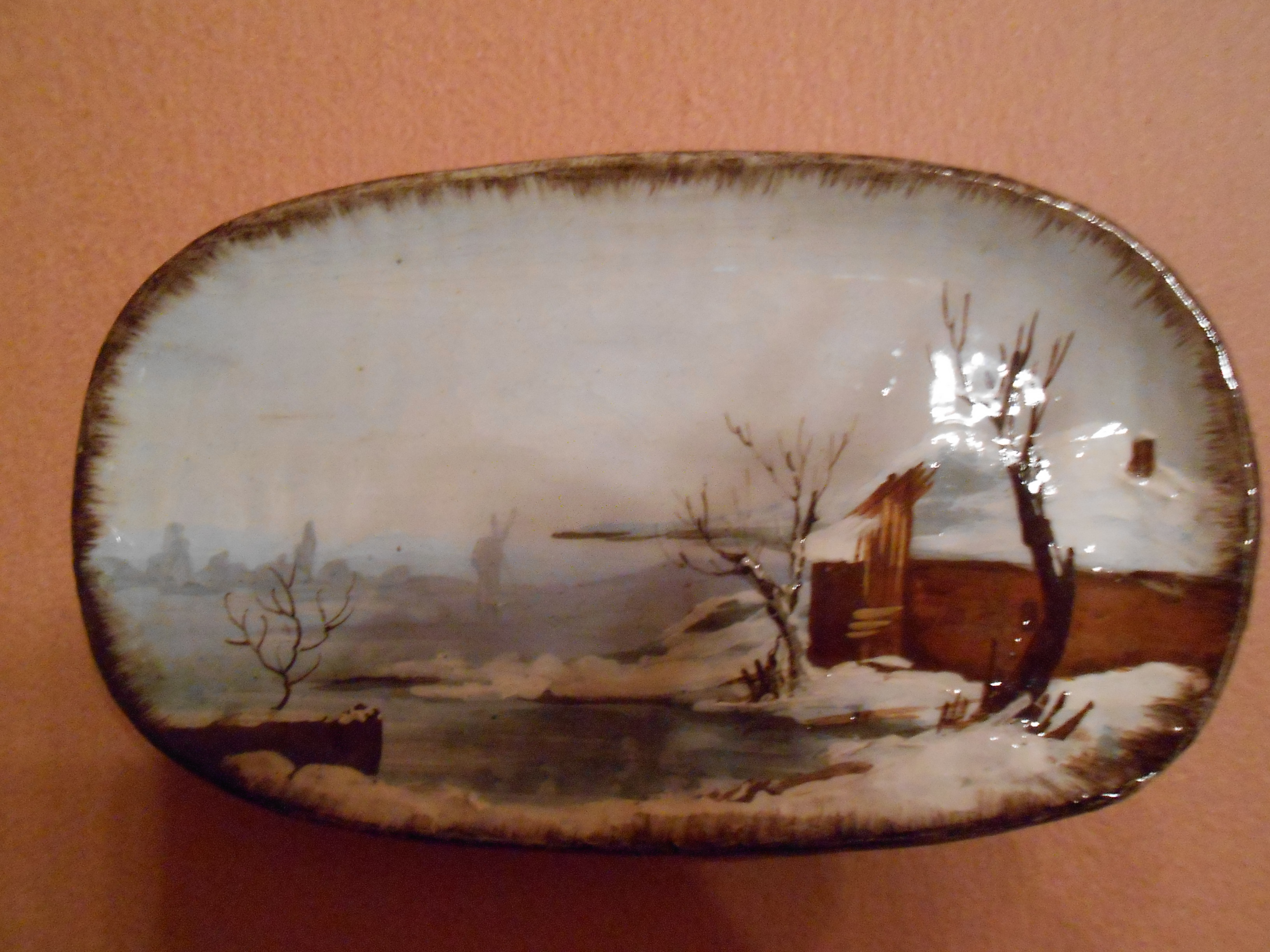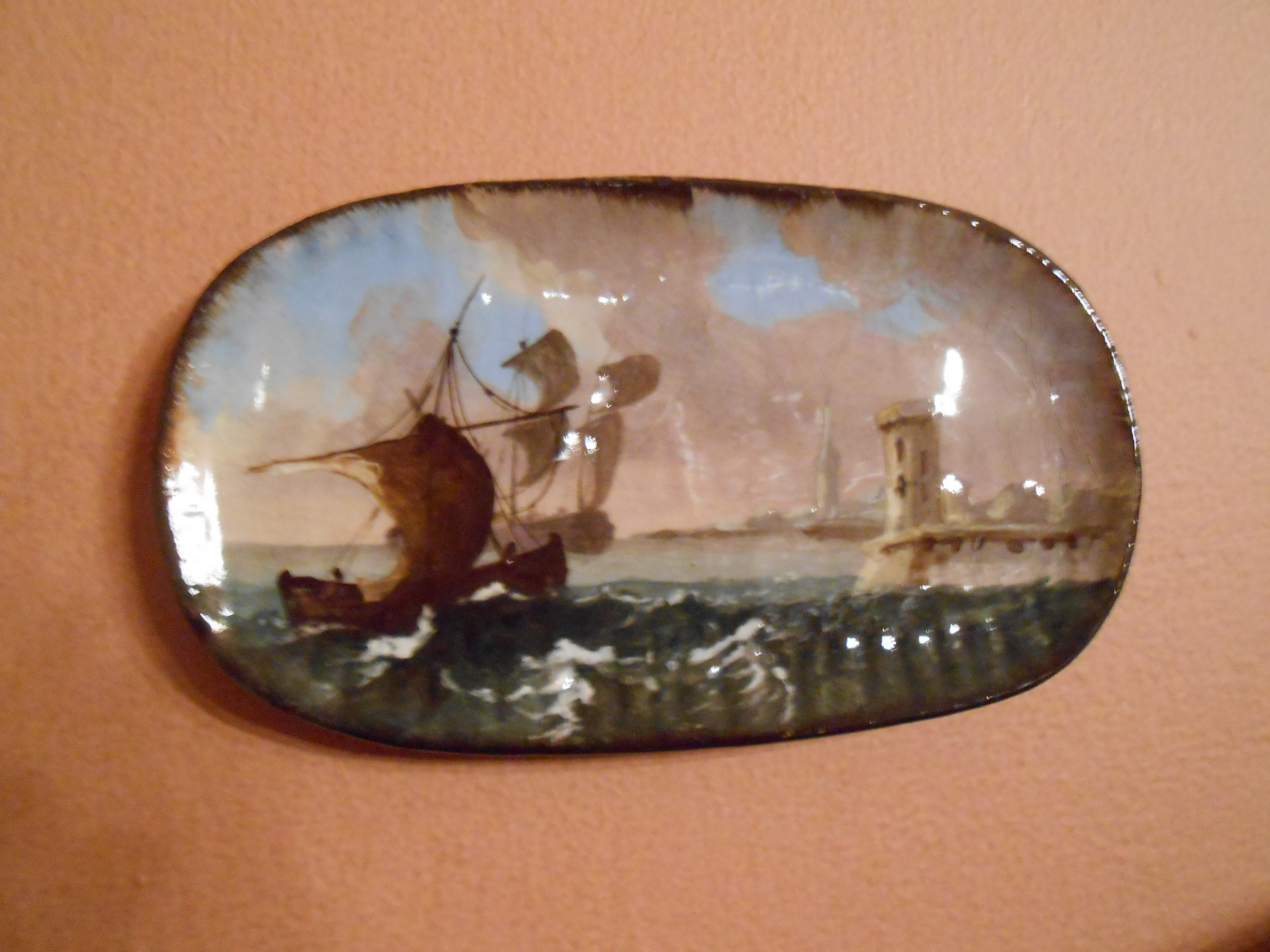 Émile Gallé was a French artist and designer who worked in glass and is one of the major innovators in the French Art Nouveau movement. Two small ceramic plaques for hanging on wall. “Ships Entering Harbor” (signed by Emile Galle of Nancy France) and “Winter Scene” (signed by Emile Galle of Nancy France). Gifts from Mary Legler Wilson. They are on exhibit Reitz Home Museum.