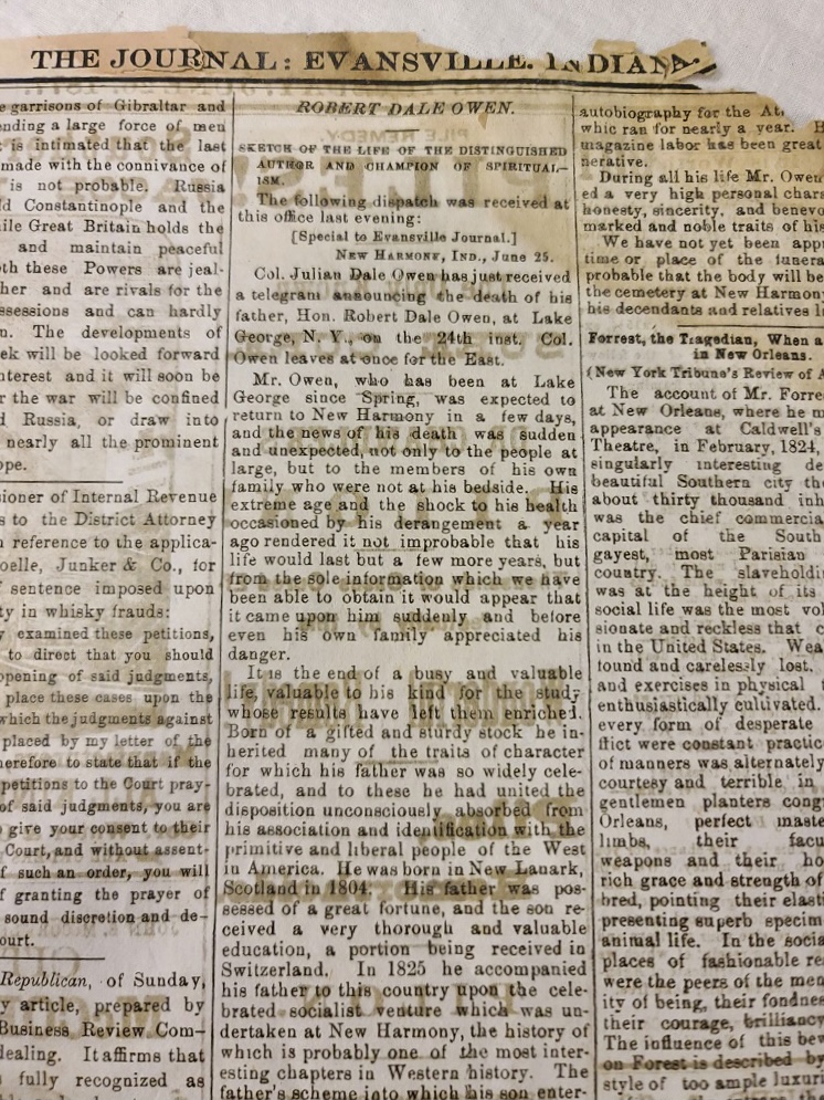 Robert Dale Owen, born in Glasglow, Scotland in 1801, was the oldest son of Welsh industrialist and social reformer Robert Owen. Robert Dale, who shared many of his father’s views, came to the Unites States in 1825 to help manage the day-to-day of the New Harmony community. Although he left shortly after the community failed, Owen returned to New Harmony in 1833 and became a successful politician. Owen served in the Indiana House of Representatives from 1835 to 1838 and 1851 to 1853. This obituary, from the June 26, 1877 edition of the Evansville Journal was printed two days after Robert Dale Owen’s death in New York.