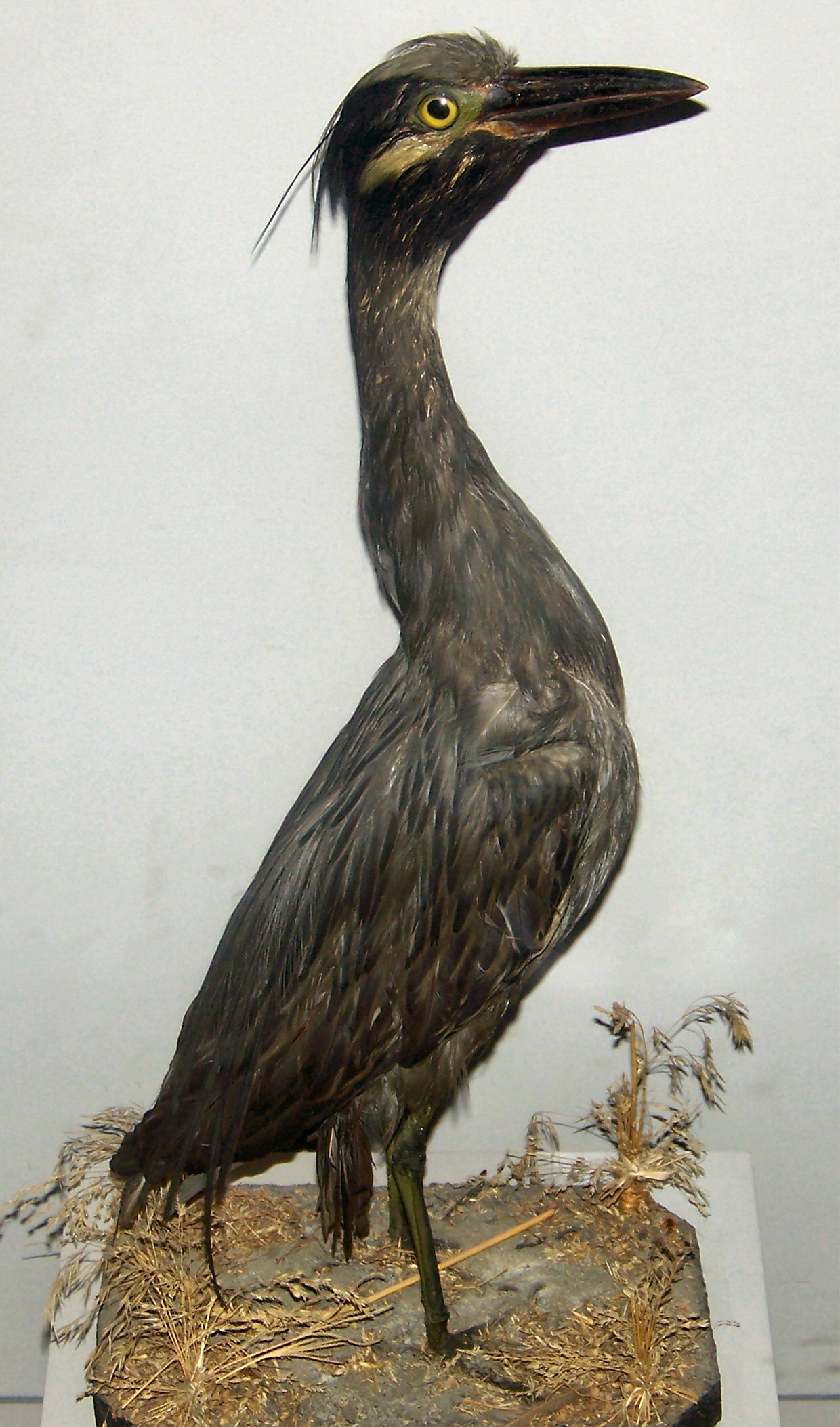 Taxidermy specimen of a male, yellow-crowned night heron that is believed to be an example of John James Audubon’s work. The heron is in a standing, alert position with both feet on a wooden platform decorated with dried grass. The heron’s neck is extended, and beak is closed. The bird has a distinctive yellow stripe running under its eyes. It is said that this heron is from Louisiana and was given by Audubon to his friend, Dr. Adam Rankin of Henderson, Kentucky, in 1812.