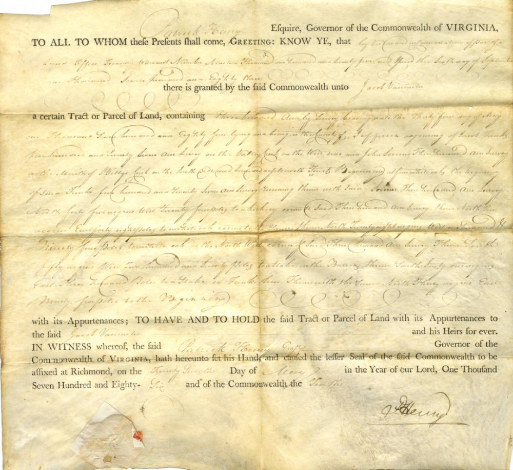 This land grant was signed by Patrick Henry, then governor of the Commonwealth of Virginia, in 1786. At this time, America’s western border did not stretch past the Mississippi River and the Commonwealth of Virginia was comparable to Great Britain in land mass. This land grant was but one step in the slow process of transforming that mass, and other land, into what we today known as the United States.