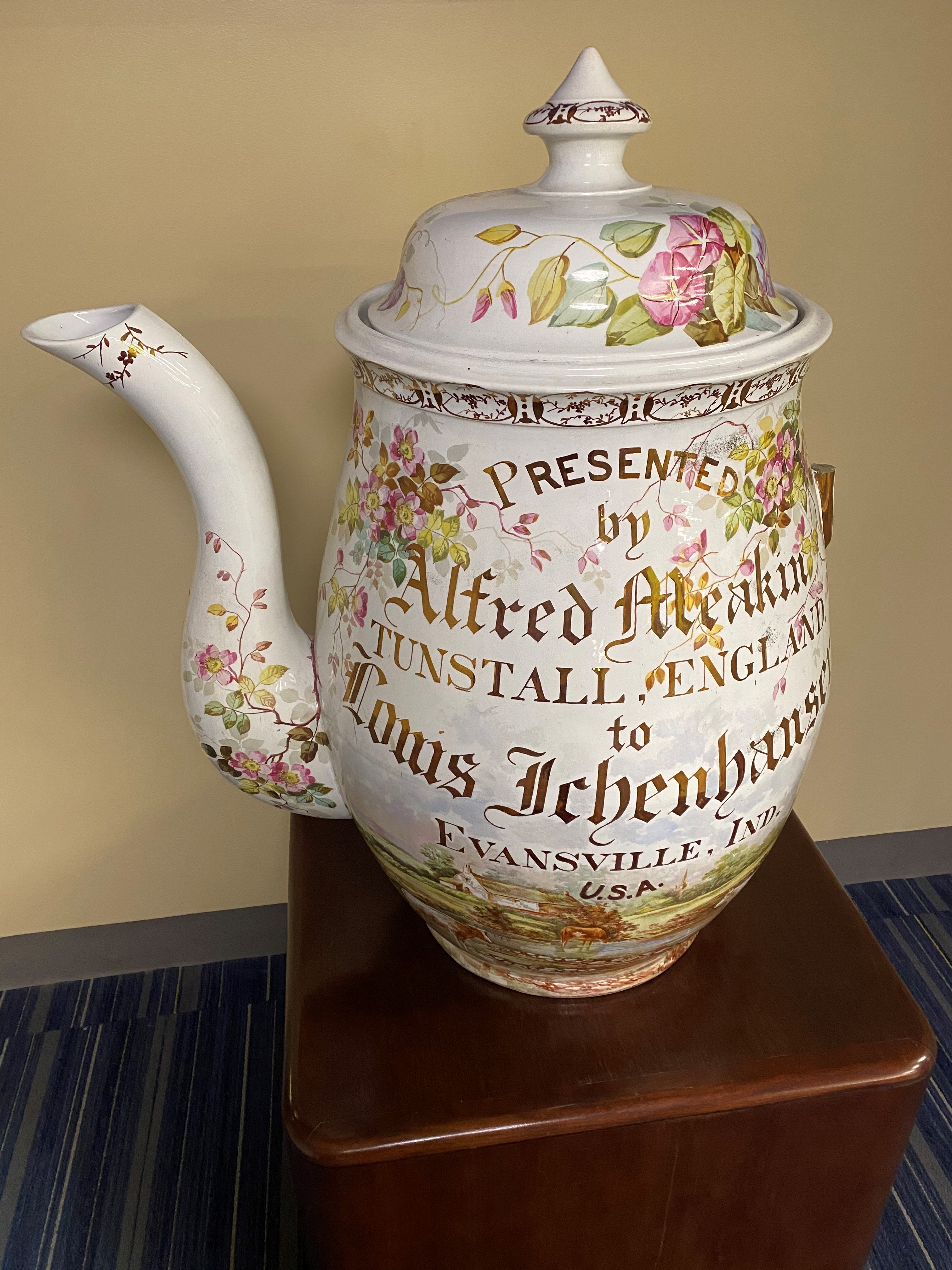 The teapot, which is made of English moss rose china, measures 37 inches high and weighs roughly 90 pounds empty, 355 pounds filled. This teapot can hold enough tea for an estimated 850 people. The hand-painted teapot was made by Alfred Meakin of Tunstall, England in 1890. It first arrived in Evansville from England as a present to the old Ichenhauser & Sons Company on NW First Street, which claimed to be the largest glass and china dealer in the Midwest. Silas Ichenhauser was a trustee of Evansville College, and when the firm closed in 1927, he presented the teapot to the college, where it was displayed for years in the front hall of the Administration Building (now Olmsted Administration Hall).