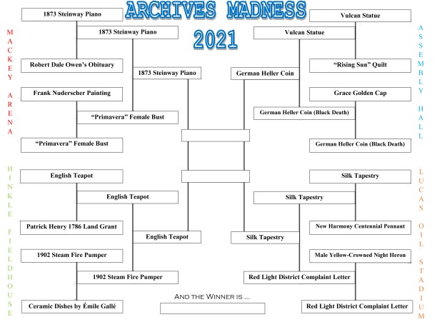 Welcome to the Final 4! The competition started with sixteen artifacts and it is now down to region champions. If you need to see the artifact descriptions, please visit the blog post, “Archives Madness 2021: Meet the Competitors“.