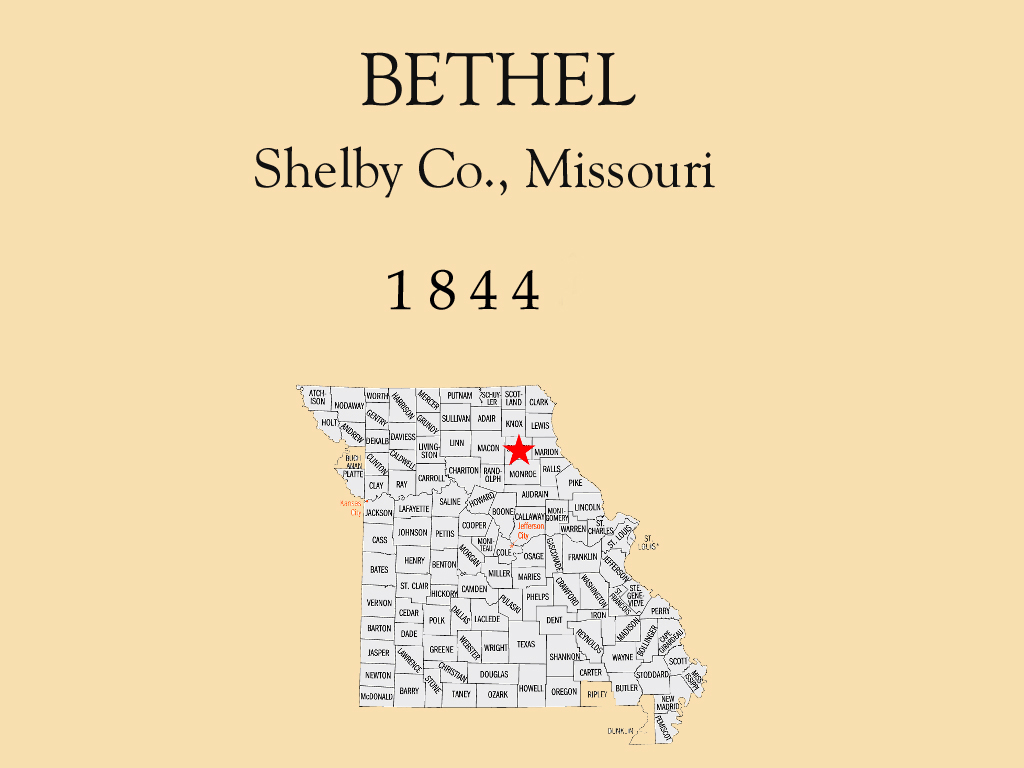 Seeking to find a place where he could establish his own community, he and his scouts purchased 2500 acres in Shelby County, Missouri, in 1844. Eventually the community of Bethel covered 4000 acres. Bethel is a Hebrew word meaning “house of God.”