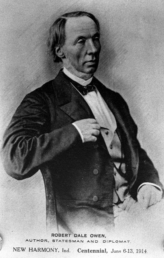 Owen’s oldest son, Robert Dale Owen (1801-1877) came along with his father in 1825 to New Harmony. He remained in New Harmony and promoted educational reform. He served in the Indiana House of Representatives 1835-1838 and 1851-1853, and in the U.S. House 1843-1847. Because of his efforts, free public education was part of the second Indiana constitution, written in 1851. In 1846 he helped establish the Smithsonian Institution, America’s “national museum.” Other Owen sons, although not part of the Boatload, also came to the United States and New Harmony. David Dale (1807-1860) gave up a career in medicine to pursue geology, and commissioned the first geological survey of Indiana in 1837. Under his leadership, New Harmony was the national headquarters for federal geological surveys from 1837-1856, before the U.S. Geological Survey came into existence in 1876. He also served as the state geologist of Kentucky, then Arkansas, and then Indiana. The youngest of Robert Owen’s sons, Richard Dale (1810-1890), succeeded his brother as Indiana state geologist, then became a natural history professor at Indiana University from 1964 to 1879, and served as the first president of Purdue University 1872-1874.