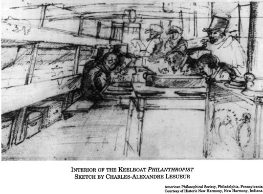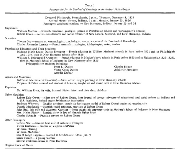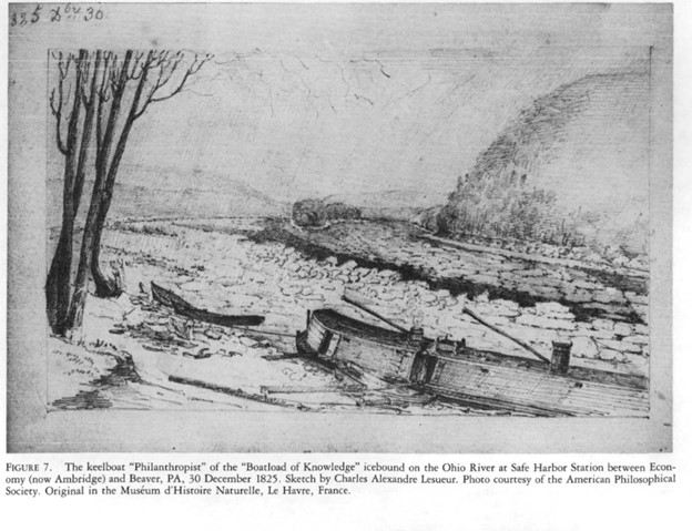 Plans began to come together when Owen came to the United States in November 1824. “He used his fame as a businessman and social reformer to propagandize his new social system among the cultural and political elite of New York, Philadelphia, and Washington, D.C. And he risked about half his fortune to purchases the town of New Harmony, Indiana, and its surrounding 20,000 acres for an original price of $135,000, which was later negotiated downward to $125.000.”iii With the site established (and a good site it was, as New Harmony at that time already had a reputation as a “wonder” town with some 180 buildings, lots of farm acreage in use, and a strong market for its products), “Maclure and Owen needed to recruit members for their new “Community of Equality,” and they opened it to anyone who wanted to join. By April of 1825, the town had between 700 to 800 residents. To jumpstart New Harmony’s intellectual heart, Maclure organized something called “The Boatload of Knowledge.” On a ship named the Philanthropist, a group of European and American geologists, entomologists, naturalists, zoologists, artists, and teachers took the month-long journey down the Ohio River from Pittsburgh to New Harmony.”iv They set out on December 8, 1824.