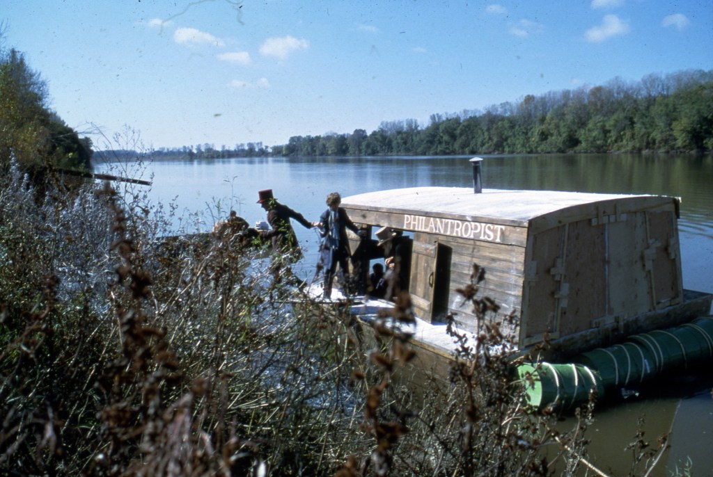 NOTE: the following two photographs are from the October 1977 filming of “The New Harmony Experience,” the first orientation film shown in the Atheneum/Visitors Center in New Harmony. (This is not the film shown today.) Nor are these photographs of the real Boatload of Knowledge, or necessarily even scale models. These are only the creation of the film’s artists as they sought to show visitors a representation of what the Boatload might have looked. Still, they are interesting and informative to give you a contemporary view of what might have been seen in New Harmony in 1826.