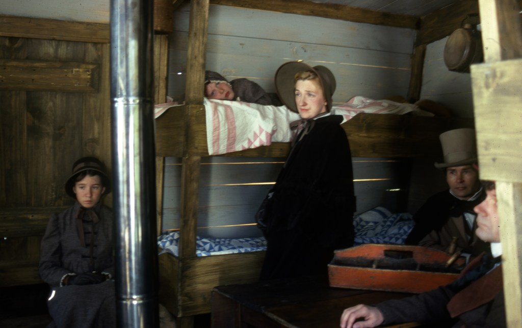 Let’s be clear about that method of transport…although a streamboat was originally intended, the water levels were too low, so a keelboat was necessary. The compartment was divided into four sections: for crew, for the men, for the women, and finally, for the children. It certainly was not luxurious, probably not even particularly comfortable, and keep in mind, these travelers were not hardy pioneers, accustomed to discomfort. The journey wasn’t particularly easy, either–just 3 days after they left and only 15 miles from where they started, they were stuck in ice. They were marooned for 28 days at a spot ironically named Safe Harbor.
