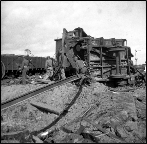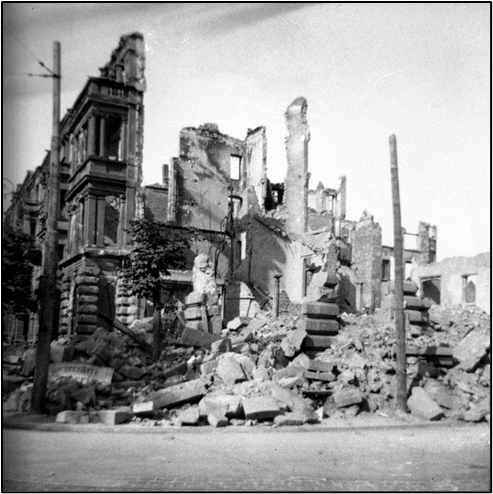 By March 30, 1945, McCutchan’s unit had moved into Germany. “The extent of the destruction was almost indescribable. Every town and village seemed to be leveled. Fields were pockmarked with bomb craters and the roadsides were littered with debris. Few civilians were seen. Now and then we would pass a family walking along the road dragging what was left of their belongings in a broken-down baby carriage. Sometimes we would see them digging among the rubble of a bombed house.” The railyard seen here showed evidence of the hundreds of freight cars that had been loaded with every possible commodity. “Many of the cars had been demolished by bombings and fire, but those that had not been destroyed had been pillaged by the armies and the liberated prisoners from forced labor camps in the vicinity—the armies looking for souvenirs, the liberated prisoners looking for food and clothing.” On April 28th, the regiment crossed the Rhine into Mannheim. “Once a lovely modern city of about 250,000 population, [it was now] a mass of ruins. Miles and miles of its streets looked like this this. Only the main streets were opened and free from rubble. Most of the side streets were impassible. It was a ghost city. Almost nobody could be seen.”