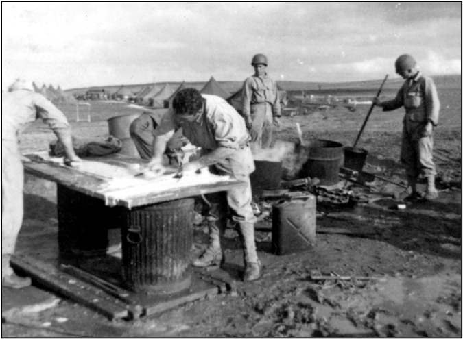 As the summer turned into fall in Tunisia, the unit continued its work of repairing roads, maintaining hospitals, and working on the docks. Back in camp, there were housekeeping chores such as the weekly laundry. While the quality of this photograph isn’t ideal, you can see the men scrubbing the clothing on a makeshift table, and in the background, getting ready to boil it to remove any germs, etc.