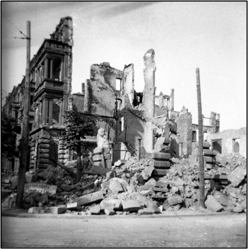 By March 30, 1945, McCutchan’s unit had moved into Germany. “The extent of the destruction was almost indescribable. Every town and village seemed to be leveled. Fields were pockmarked with bomb craters and the roadsides were littered with debris. Few civilians were seen. Now and then we would pass a family walking along the road dragging what was left of their belongings in a broken-down baby carriage. Sometimes we would see them digging among the rubble of a bombed house.” The railyard seen here showed evidence of the hundreds of freight cars that had been loaded with every possible commodity. “Many of the cars had been demolished by bombings and fire, but those that had not been destroyed had been pillaged by the armies and the liberated prisoners from forced labor camps in the vicinity—the armies looking for souvenirs, the liberated prisoners looking for food and clothing.” On April 28th, the regiment crossed the Rhine into Mannheim. “Once a lovely modern city of about 250,000 population, [it was now] a mass of ruins. Miles and miles of its streets looked like this this. Only the main streets were opened and free from rubble. Most of the side streets were impassible. It was a ghost city. Almost nobody could be seen.”