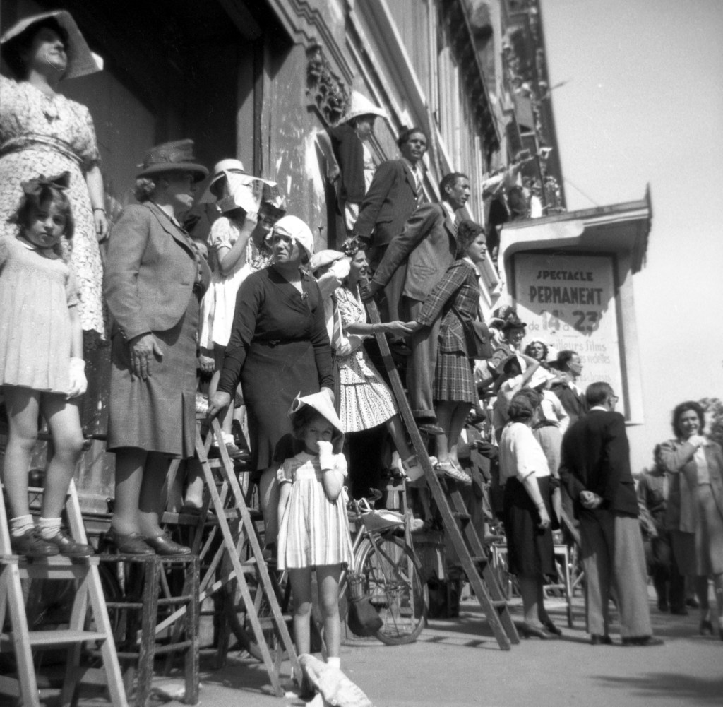 June 11, 1945’s journal entry: “An interesting memorandum came out today announcing that the University of Paris is soon to take 750 U.S. Army students for eight weeks courses in languages and studies in French culture. … I have been hoping for an opportunity like that. … It would be wonderful to live in Paris for a while.” July 3 brought an official letter from Bremen Post Command about this course of study, but McCutchan, uncertain his Colonel would approve his application, asked directly and was told yes. July 10: “Sgt. Iula and I have been selected for the course at the Sorbonne. Our travel orders will be out tomorrow.” He was in Paris the next day, eager to embark on this new adventure. He was early since classes didn’t start until the 16th, but was able to enjoy the Bastille Day celebrations. This was the first Bastille Day celebration since Paris and France were liberated, so crowds were really exuberant. Under this photograph in his scrapbook, McCutchan notes, “Sidewalks for miles along the route of the parade were jammed with people from soon after dawn. They stood on chairs, on step ladders, sat on one another’s shoulders, hung from windows. Those who were unable to see a thing cheered and screamed just as loudly as all the others when the parade came by.”