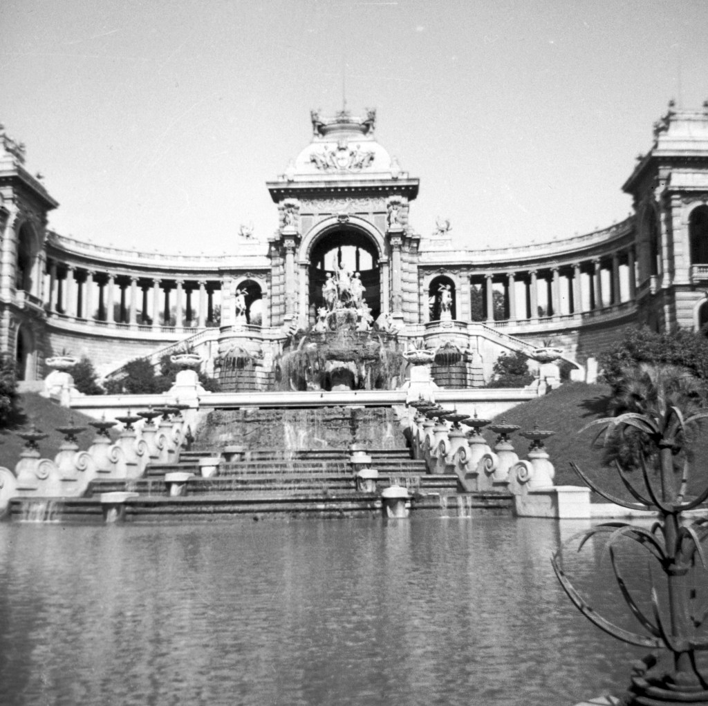 In August they moved to southern France, arriving in Marseille on September 2, where he found that despite much damage, many parts of Marseille retained its historic beauty. His visit to the Palais Longchamp is a good representation of the sights he enjoyed. His scrapbook says, “The Palais Longchamp is a series of great buildings in the style of the Italian Renaissance erected about 1869. The Museum of Fine Arts on the left and the Museum of Natural History on the right are joined to the central building by semi-circular colonnades. A grand fountain ornamented with statuary feeds a pool in the front of the palace.”