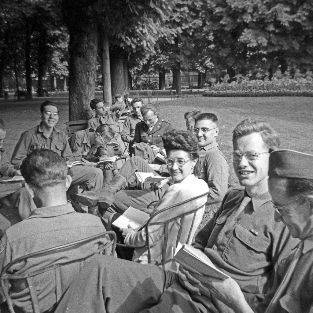 Students in the Latin Quarter of Paris customarily studied outdoors on very warm days. They often went as a group to the nearby Luxembourg Gardens and sat under the huge chestnut trees. Here are some of his classmates with their teacher, Mademoiselle Louise Durand. Mlle. Durand worked with the underground during the German occupation, “caring for allied fliers whose planes were shot down over France. She and her group smuggled the fliers into Paris, fed and housed them and supplied them with civilian clothes until arrangements could be made to have them taken back to England. Mlle. Durand, who had studied in England before the war, maintained secret short-wave radio communication with her friends there, and through them made the arrangements to have the men picked up by reconnaissance planes that would make quick landings for that purpose in secluded spots in the country. In order to protect herself in case she was arrested by the Germans, she carried various kinds of false identification.”