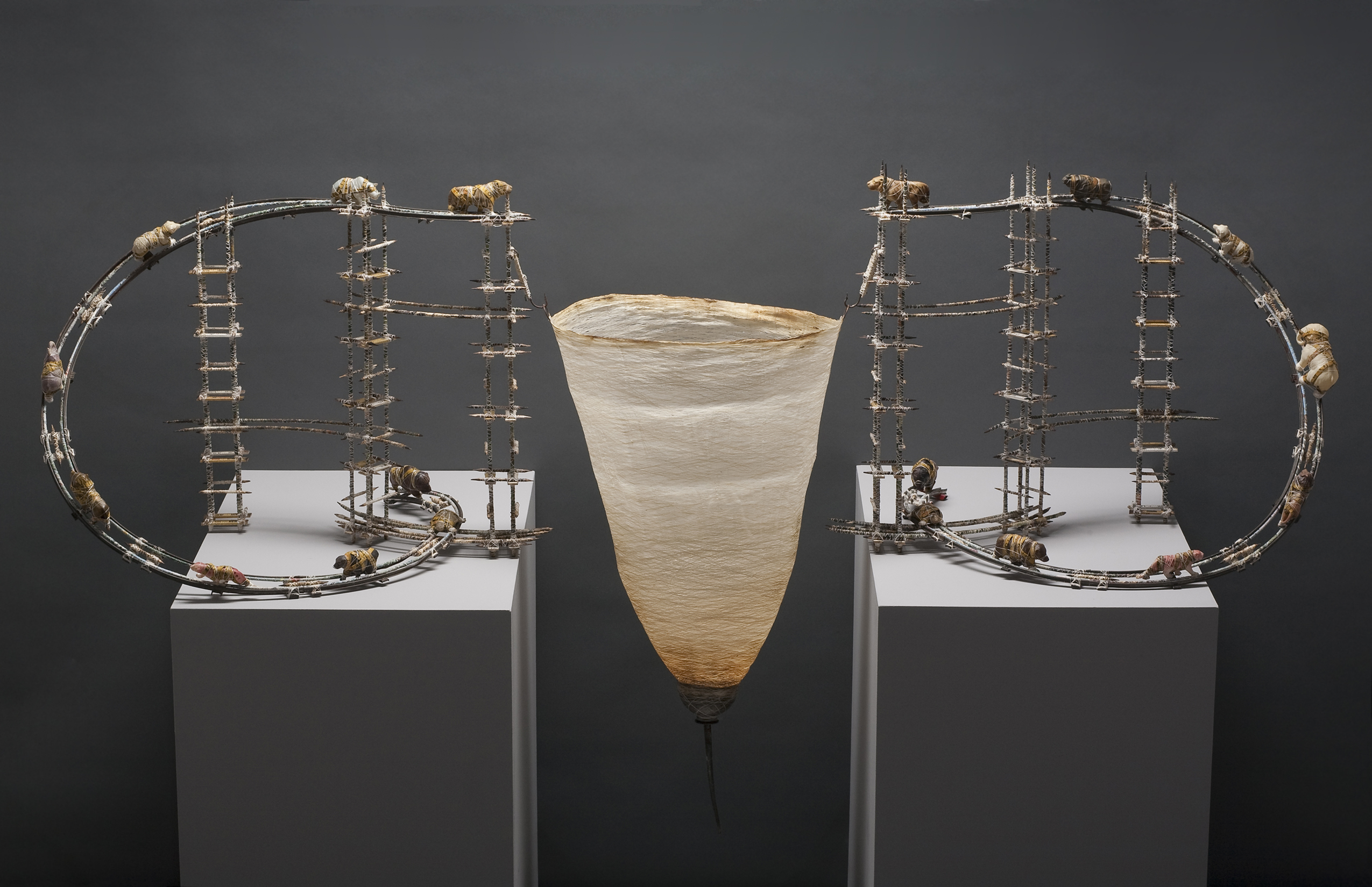 The second item is a piece of artwork, Into the Abyss, by artist Sandra Jane Heard. It is made of silk yarn, reeds, paper and found objects. It was the winner of the Evansville Museum Guild Purchase Award at the 43rd Annual Mid-States Craft Exhibition in 2013-2014.