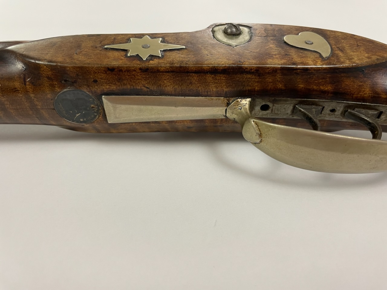 The second entry is this Civil War era Pennsylvania/Kentucky long rifle. It was made by Charles Flowers of Harmony, PA, where he maintained a gunshop. The stock is of curly maple with German silver inlays, while other parts are of brass. There are 2 silver U.S. dimes inlaid in the stock, and the barrel is 36″ in length. It’s from University Archives (UA 058, Historic New Harmony).