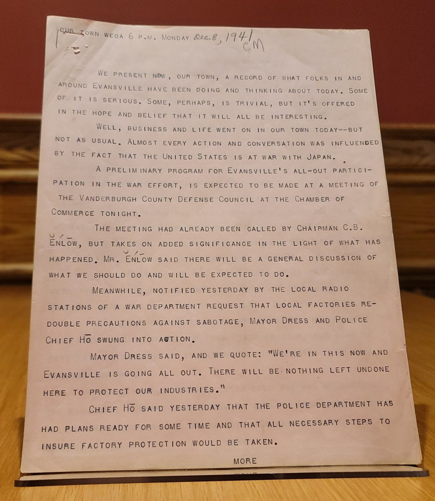 Second is this WGBF radio broadcast script from December 8, 1941. Entitled “Our Town,” it is an example of a 15 minute evening radio segment ready by Clifton “Cliff” Brooks throughout the 1940s. This script describes local reactions the day after the bombing of Pearl Harbor.