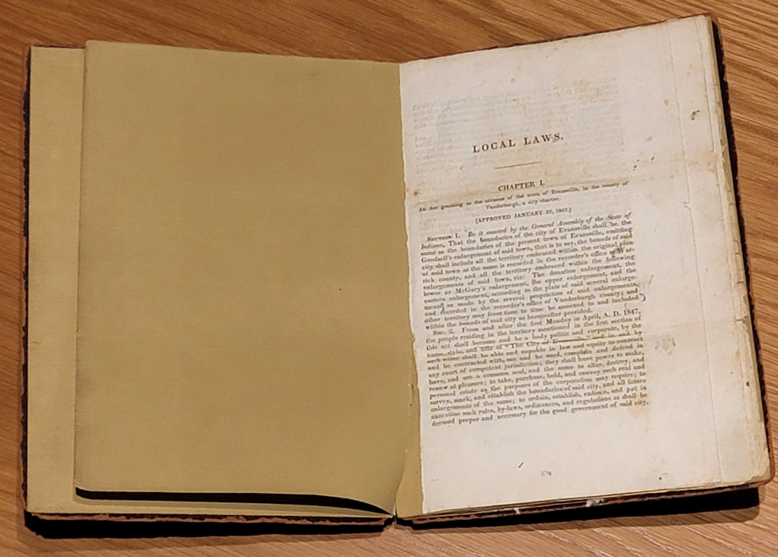 First is this original charter of the city of Evansville. An act granting Evansville a city charter was approved by the state of Indiana on January 27, 1847. The Secretary of state issued this certified copy.