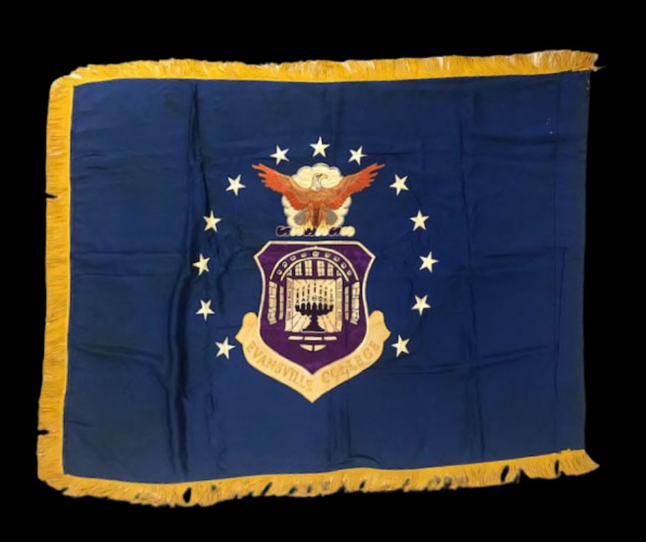 The first item is this Evansville College V-5 Naval Aviation Banner. The banner, made of dark blue fabric edged by gold tassels, features a bald eagle and the Evansville College seal surrounded by a ring of stars. In 1943. Evansville College was assigned a V-5 segment of the U.S. Navy’s pilot training program. By 1944, the College had trained a total of 335 Navy cadets and received recognition from the U.S. Department of the Navy for its efforts.