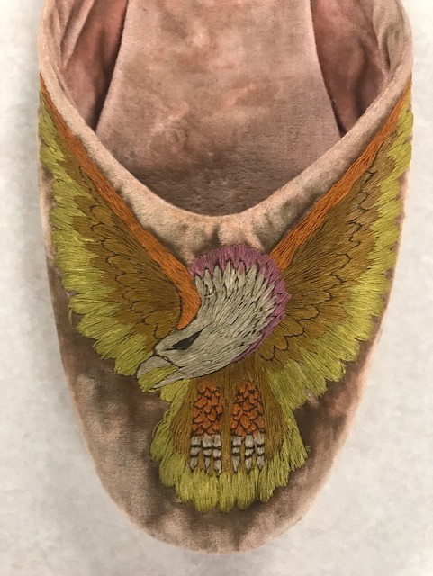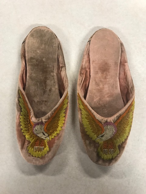 The next item is this pair of women’s slippers from China. They are pink with felt lining the inside and outside, and the tops of the feet are ordained with a sewn green, purple, and orange bird. A brand has been stamped on the bottom of the slippers.
