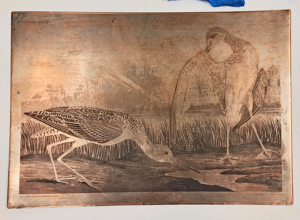 This is an original copper engraving plate made by Robert Havell, Jr., for printing John James Audubon’s illustration of “The Tell-tale Godwit” in The Birds of America. Only around 80 of the 435 plates used in the publication still survive today, the rest having been melted down for scrap in the late 19th century.