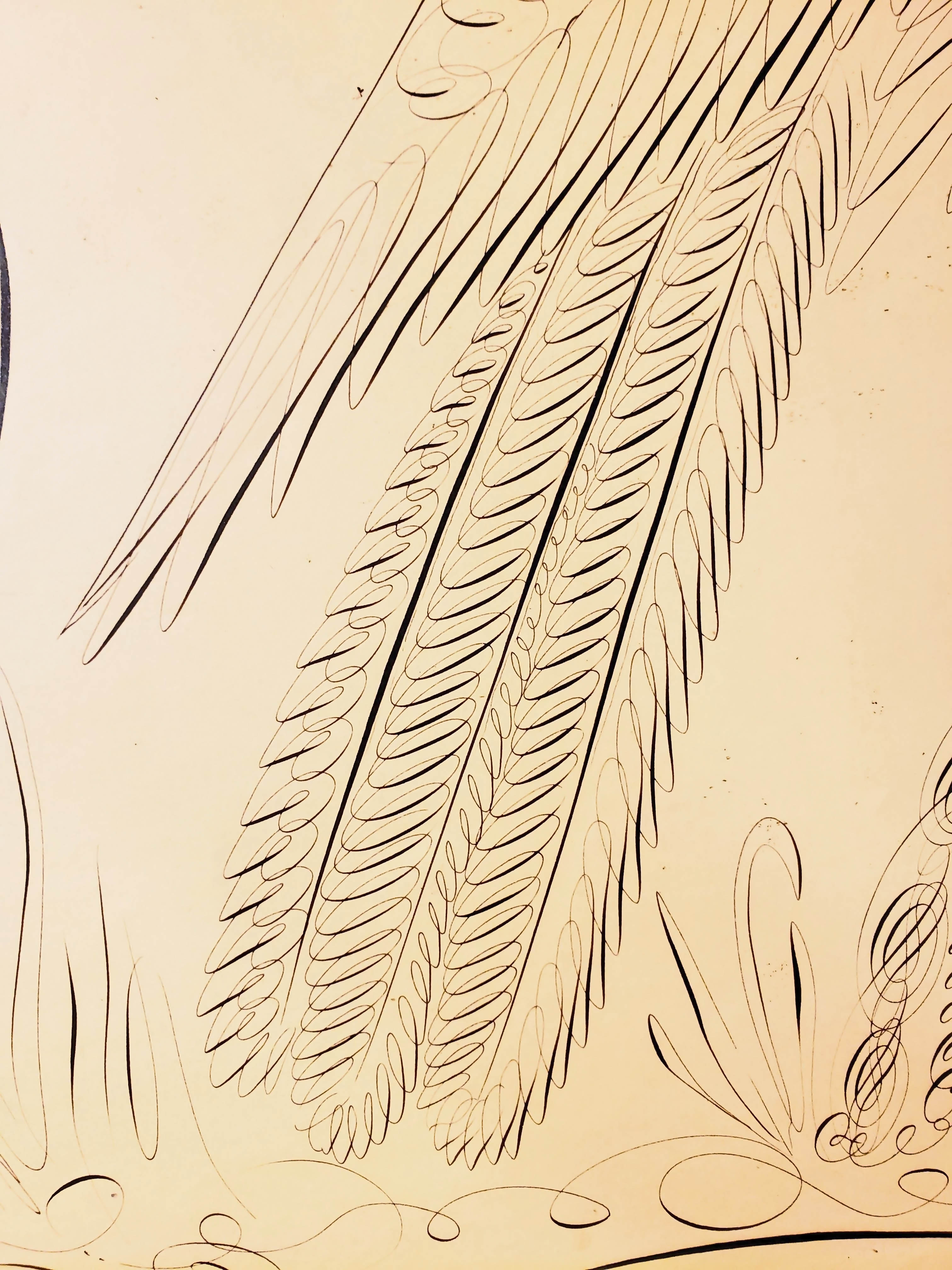 This is a calligraphic drawing made by 19th century penman Oliver B. Goldsmith as a gift for John James Audubon’s son, Victor Gifford Audubon. Inspired by Audubon’s illustration of the “Marsh Hawk” (Plate 356) in The Birds of America, the drawing is composed entirely of decorative flourishes hand-drawn in black ink.