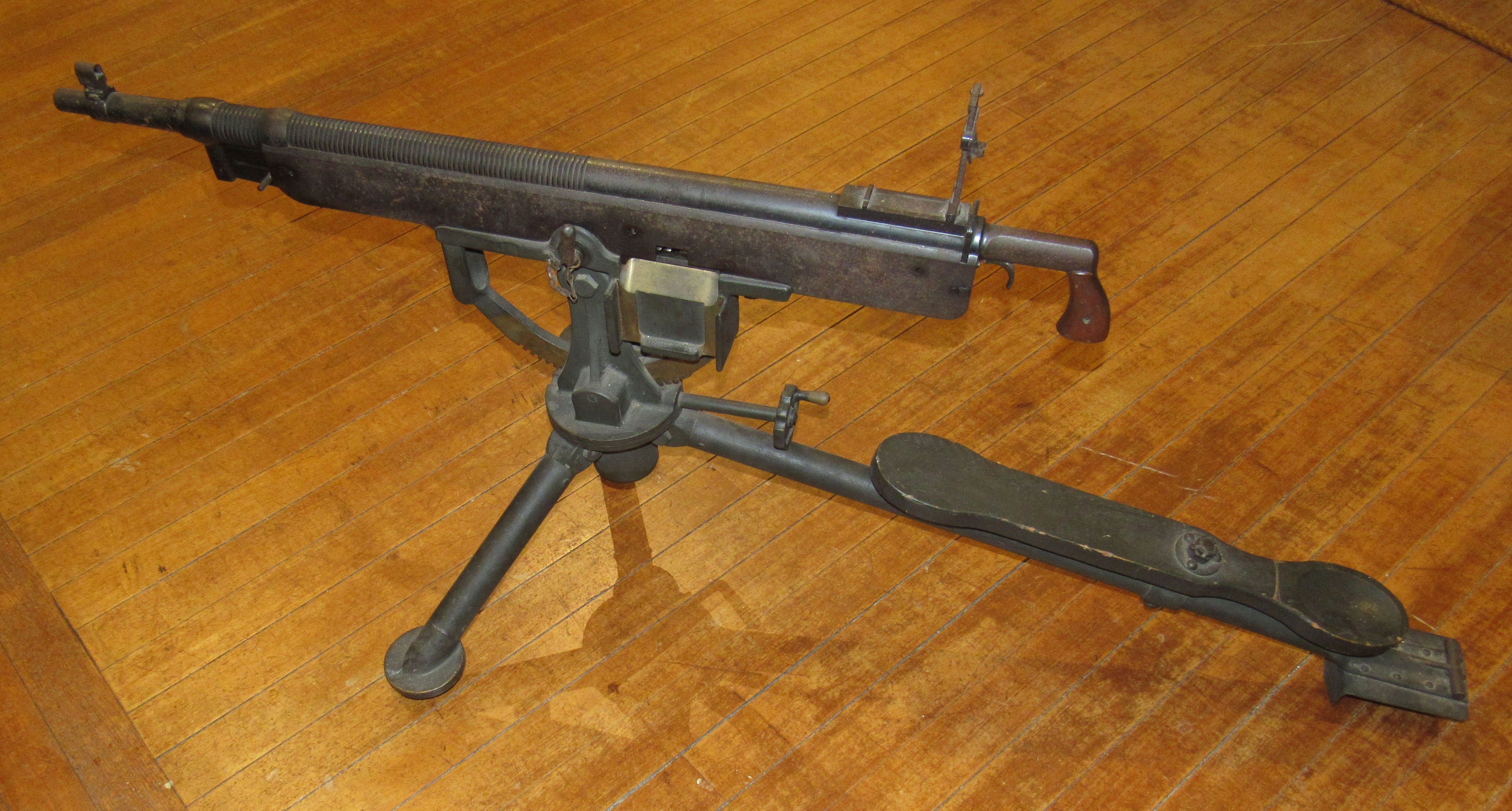 Next is this Colt machine gun, Model 1906. made by Marlin Arms for use in World War I. It is a .30 caliber gun and is mounted on a tripod. It was given to the WMI by the U. S. Ordnance Department. These guns were nicknamed “potato diggers” because of the action of a downward swinging lever at the front of the gun, propelled by hot gas from an exiting bullet. It could actually dig into the ground if the gun were fired too low to the ground.