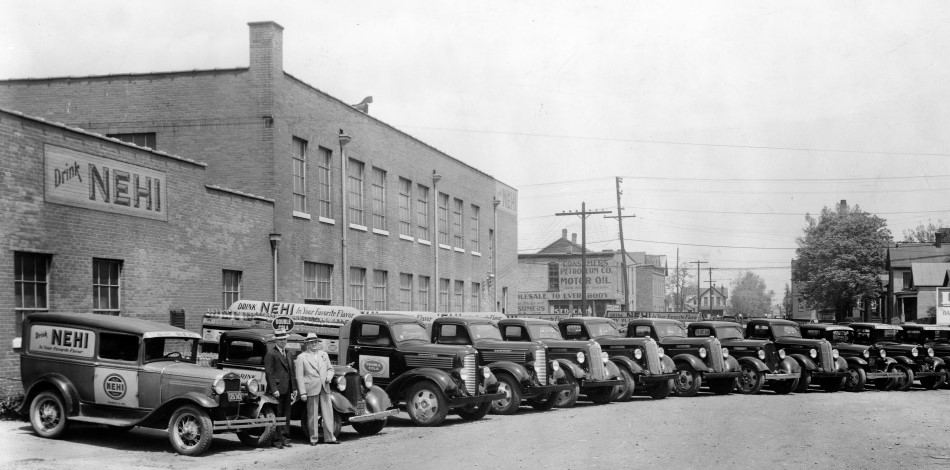 In the undated photograph below, this fleet of delivery vehicles was outside the Royal Crown/Nehi bottling plant at 400 N. Main St. (The cross street shown here would be Michigan St.) This bottling plant no longer exists. Nehi was introduced in 1924 by Chero-Cola/Union Bottle Works. The “Nehi Corporation” name was adopted in 1928 after the Nehi fruit-flavored sodas became popular. In 1955, the company changed its name to Royal Crown Company, after the success of its RC Cola brand. In April 2008, Nehi became a brand of Dr Pepper Snapple Group in the United States.