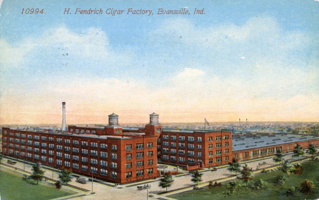 Herrmann Fendrich was born in Germany in 1830 and immigrated to the United States as a child with his family in 1833, settling in Baltimore, MD.. In the 1840s he and his brothers opened a cigar factory and eventually moved to Evansville. In 1855 the factory moved to a location on Main St. In 1910 that location was destroyed by fire and the factory rebuilt on Oakley St. It ceased operation in 1969, became Imperial Plastics, and later was renamed Berry. Today’s building completely subsumes the cigar factory.