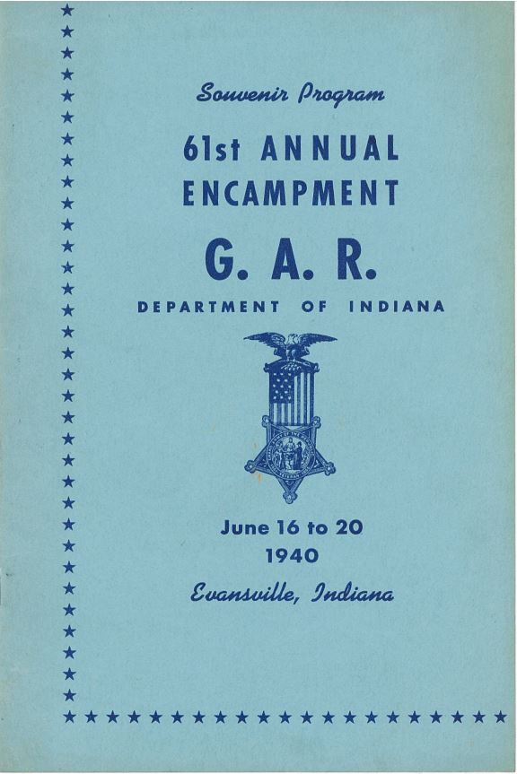 “The first national gathering of the Grand Army of the Republic was held in Indianapolis, Indiana and was called an Encampment just as in their soldier days, and all subsequent yearly national reunions were so designated, comprising 83 National Encampments from 1866 until 1949 the last Encampment held in Indianapolis, when only six members could be mustered.”ii Seen below is a program from a 1940 Indiana GAR encampment, held here in Evansville, and found in MSS 319.