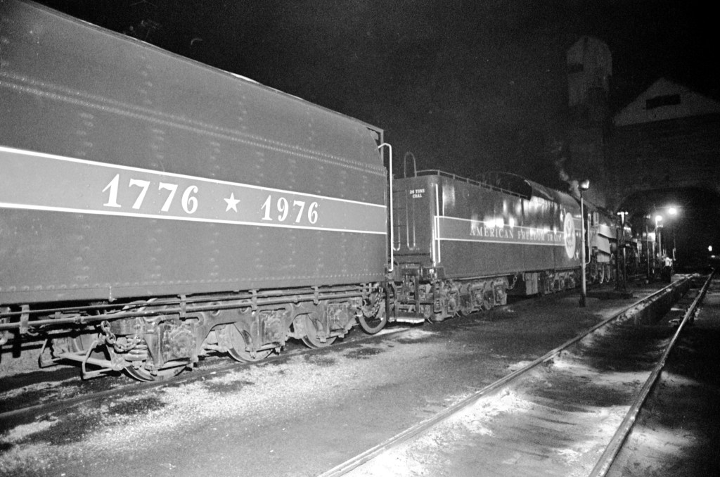 The following images are from MSS 034, the Greg Smith Collection. They show the visit of the American Freedom Train to Evansville June 15-17, 1976. The train sat on a siding behind the (then) Civic Center complex (today’s Old National Events Plaza) and was open for touring. “The triumph of the steam-powered American Freedom Train was, indeed, the only nationwide celebration of the Bicentennial. It was pulled by steam locomotives in the age of the diesel, and would improve on the three display cars of its predecessor, the 1947 Freedom Train. The American Freedom Train would feature twelve display cars, ten that visitors would go aboard and pass through and two to hold large objects that would be viewed from the ground through huge “showcase” windows. The display cars were filled with over 500 precious treasures of Americana. Included in these diverse artifacts were George Washington’s copy of the Constitution, the original Louisiana Purchase, Judy Garland’s dress from The Wizard of OZ, Joe Frazier’s boxing trunks, Martin Luther King’s pulpit and robes, and even a rock from the moon. The American Freedom Train (AFT) was a 26-car train led by one of three enormous steam engines restored just for the occasion. Over a 21 month period from April 1, 1975 to December 31, 1976 more than 7 million Americans visited the train during its tour of all 48 contiguous states. Tens of millions more stood trackside to see it go by.”
