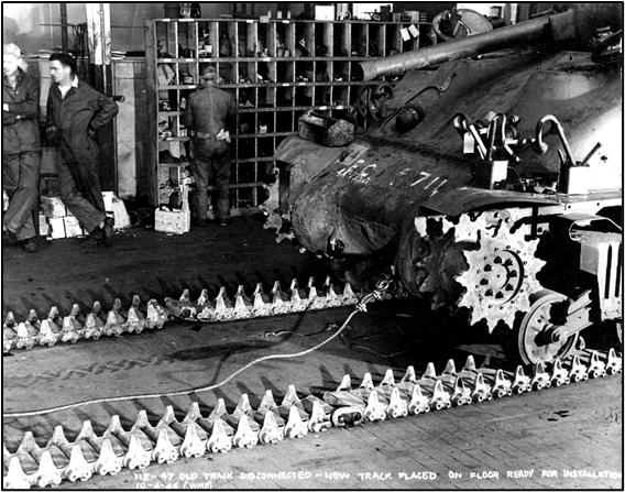 Those 1,662 Sherman tanks that were retrofitted at this facility arrived, some in poor condition, by rail. While awaiting repair or awaiting return to the front lines, they were kept in this tank storage yard seen below. In the foreground you can see some of the turrets. In the other two photos, the track or tread is being replaced.