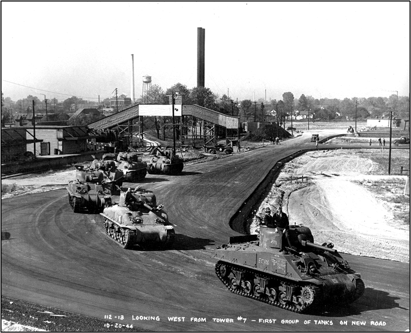 The image below depicts the first group of tanks on the “new road.,” October 20, 1944. Another interesting thing in this photograph is that light- colored arch in the center. That was part of the conveyor assembly that carried ammunition from manufacture at the Ordnance Plant to a separate packing plant.