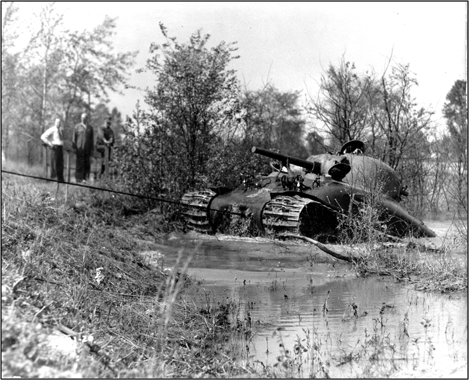 Above is a group shot of the tank test drivers, taken on February 2, 1945. Tanks are meant to be all terrain vehicles, so not all the testing took place on this track—there was “off-road” testing, too. And, as you can see below, it didn’t always go to plan. I’m pretty sure that tank is supposed to drive out of the lake, not be towed!