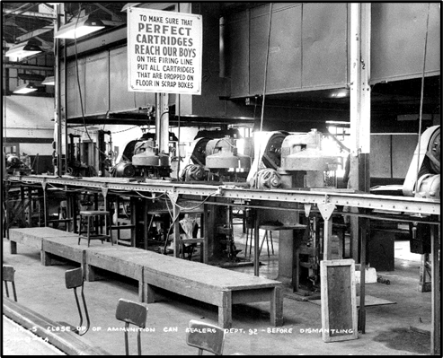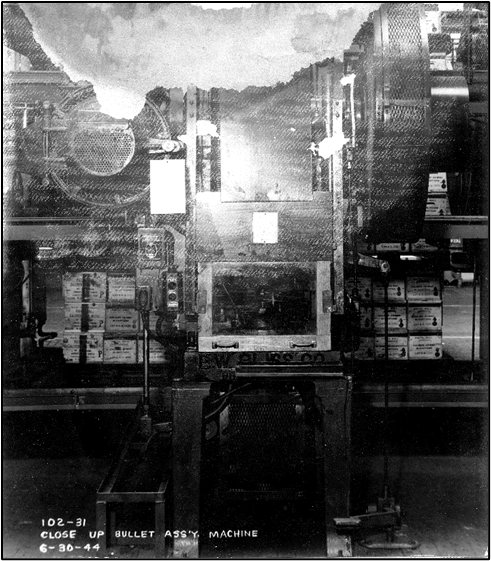 Chrysler president W.T. Keller was certain that the Evansville plant could meet any demand. Soon, Chrysler vice president Charles L. Jacobson, tasked with organizing and running the new operation, got an Army Ordnance team to inspect and approve the Evansville plant and a letter of intent for the making of 5,000,000 .45 caliber cartridges a day. One week later, Army Ordnance phoned Jacobson and increased the order to 7,500,000 rounds a day. Within twenty-four hours Army Ordnance again called and gave Jacobson another change order – increasing production to 10,000,000 rounds a day. Before the month ended, that number had jumped yet again to 12,500,000 rounds. Jacobson had doubts such an order could be fulfilled, but with Keller telling him to make it happen, Jacobson worked out a co-production agreement with Sunbeam, who had a plant near Evansville. On Feb. 18, 1942, Washington’s Birthday, the formal contract with the government was signed. The transformation of the Evansville plant from assembly line to arsenal began the next day. Cartridges made at the Evansville arsenal had seven parts, passed through 48 processing operations, and had to survive 334 quality control inspections. On June 30, 1942, the first bullets produced there were test fired. From June 1942 to April 20, 1944 when the contract ended, Chrysler’s Evansville arsenal produced 96 percent of the military’s .45 caliber cartridges: 3,264,281,914 rounds. Rejection rate of cartridges was less than .1 percent of production. It also produced almost a half-billion .30 caliber cartridges, hundreds of thousands of specialty rounds, reconditioned 1,662 Sherman tanks, rebuilt 4,000 Army trucks, delivered 800,000 tank grousers (track extensions for use in mud), and was preparing to make 7 million fire bombs when the war ended.[iv]
