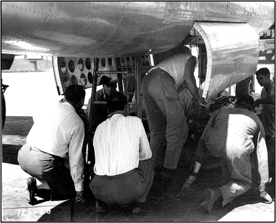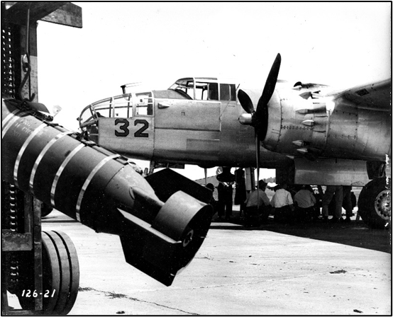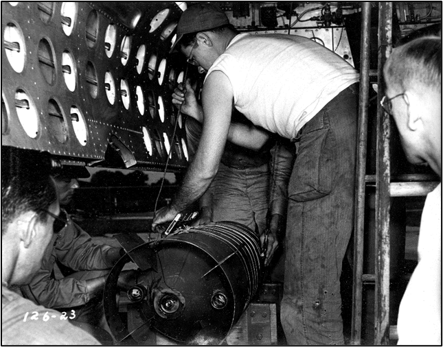 This plant also built cluster bombs. These photographs depict this type bomb being loaded onto a B-25 bomber.