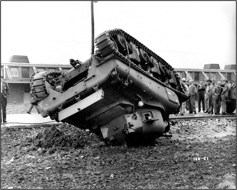 Above is a group shot of the tank test drivers, taken on February 2, 1945. Tanks are meant to be all terrain vehicles, so not all the testing took place on this track—there was “off-road” testing, too. And, as you can see below, it didn’t always go to plan. I’m pretty sure that tank is supposed to drive out of the lake, not be towed!