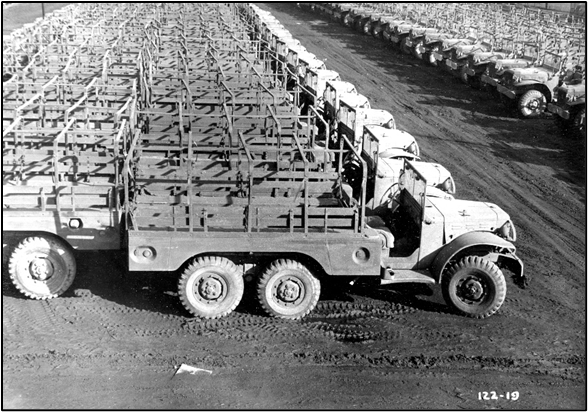 Below is a close-up of the storage yard for the 4,000 Army trucks that Chrysler rebuilt.