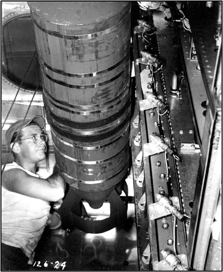 This plant also built cluster bombs. These photographs depict this type bomb being loaded onto a B-25 bomber.