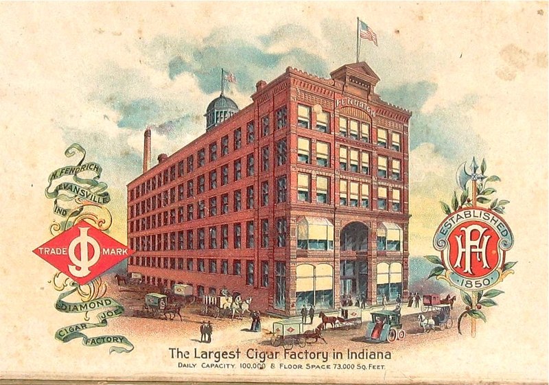 Full disclosure: this blog is not about carnival games and prizes, but rather about a cigar factory that operated in Evansville, Indiana for some 114 years. The origins of this story go back to 1833, when six members of the Fendrich family (mother, father, four sons: Joseph, Charles, Francis, and Herrmann) immigrated to the United States and settled in Baltimore, MD. They came from southwestern Germany (then the Holy Roman Empire), from the Baden area. The family soon grew with the addition of a fifth son, John. Sometime in the 1840s the four oldest sons decided that the cigar and tobacco business would be a good fit for them and so apprenticed themselves to members of that trade around Baltimore. Their motivation for entering this field is unknown, although the area of Germany from whence they came was known for cigar making. Probably more relevant is the fact that during the 1830s Cuban cigars gained in popularity, and the United States began to produce better quality tobacco. It seemed to be a lucrative trade to enter, with Baltimore one of the top cigar centers in the country.