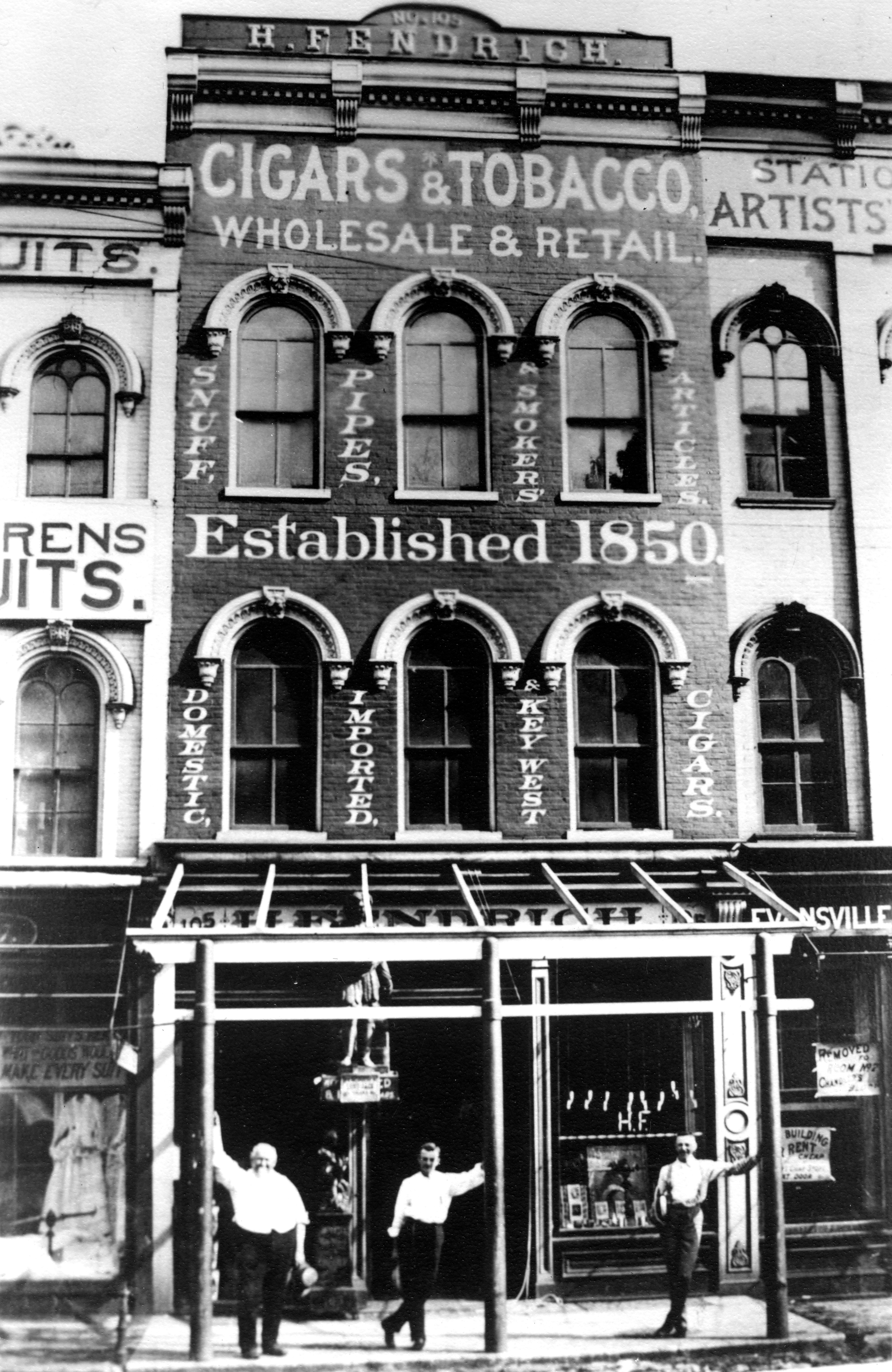 By 1850 all five brothers felt confident enough to open their own factory, at 155 Forrest Ave. in Baltimore. Their main product was plug tobacco, which came from Kentucky. (Plug tobacco is chewing tobacco, densely compressed into a square.) They also opened a production factory in Columbia, Pennsylvania. It is clear that the Fendrichs were successful; only five years later they moved their operations to Evansville. This put them not only nearer to the Kentucky source of their tobacco, but also in an excellent location to take advantage of river transportation down to New Orleans and out to the wider world.