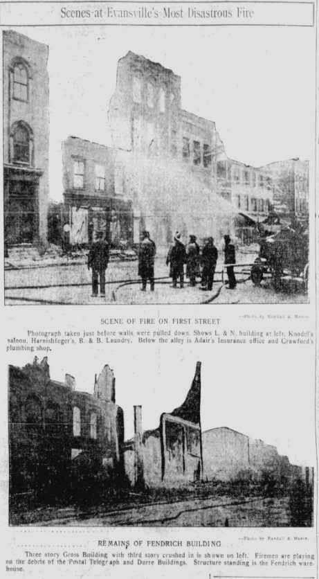 Disaster struck on December 6, 1910, when a massive fire completely destroyed the factory, taking with it ten nearby businesses and one private residence. The fire was at night, so no employees were killed, but equipment and stock suffered a total loss. The December 7, 1910 Evansville Courier reported that the fire was thought to have started with a gas leak. “Chief Grant and Assistant Chief Wilder believe such must have been the cause from the rapid spread of the flames in the Fendrich building. … New gas pipes were laid in the building Monday. They were attached to an old pipe that had not been used for fifteen or twenty years. At 5 o’clock in the afternoon, the pipes were tested and found to be in good order. It is the theory of Mr. Fendrich that after all the lights had been turned off, the old gas pipe sprang a leak from the increased pressure and gradually filled the building.”v The newspaper detailed $594,750 in total losses, $457,000 of which was the cigar factory, the Fendrich building, warehouse stock, and insurance on the stock. Many workers arrived to work that morning, completely unaware of what had happened. Famous Courier cartoonist Karl K. Knecht showed their dismay.