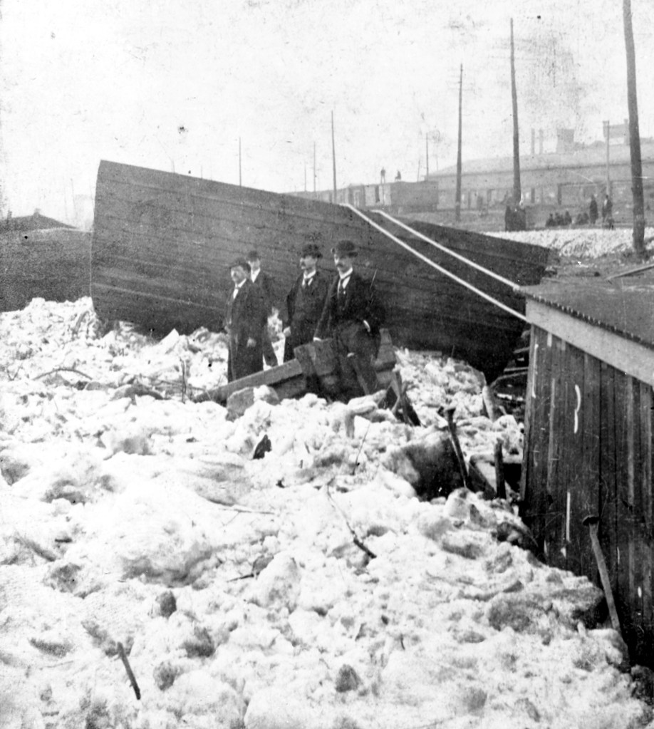 Probably related to this 1856 freeze in Cincinnati is this tale from St. Louis in December 1855. “When the river froze over during the bitterly cold month of December 1855, newspapers nicknamed it the ice gorge. An expansive ice sheet fused St. Louis to the Illinois shore, and just like every other time the river froze, city officials begged St. Louisans to stay off it. Unsurprisingly, their pleas were ignored: thrilled St. Louisans came out by the hundreds for ice parades, midriver bonfires, and carriage rides. They set up makeshift businesses on the new frozen real estate, including bowling alleys, skating rinks, pop-up saloons, and gambling houses. Farther from the levee, brewery workers chopped away large chunks of river ice to pack into their beer cellars. … The ice revelers disappeared as the weather warmed up — which is precisely when catastrophe struck. On Feb. 27, 1856, some St. Louisans noticed that a few of the docked steamboats had been nudged up onto the levee’s dry cobblestones. This was the first sign of a slow-motion disaster. As the sheet of river ice broke up and moved, it dragged more than 100 steamboats along with it. Astonished, St. Louisans gathered on the riverfront, listening to the eerie snaps and booms as the ice’s powerful force crushed one boat after another. The St. Louis Republican reported on the chaos: . . . the destruction commenced . . . [the steamers] were torn away from shore as easily as if they had been mere skiffs, and floated down with the immense fields of ice. The shock and crashing of these boats can be better imagined than described. All their ample fastenings were as nothing. . . . The whole business portion of the levee was clear of boats. . . . There was not a single boat at the levee which entirely escaped injury. The ice piled up into a jagged, 20-foot-high wall along the riverfront, twisted pieces of steamboats mixed throughout. As the blackened piles of slushy ice melted away that spring, they left behind a graveyard of pulverized boilers, mangled brass chandeliers, crunched china, and splintered bed frames.”ii